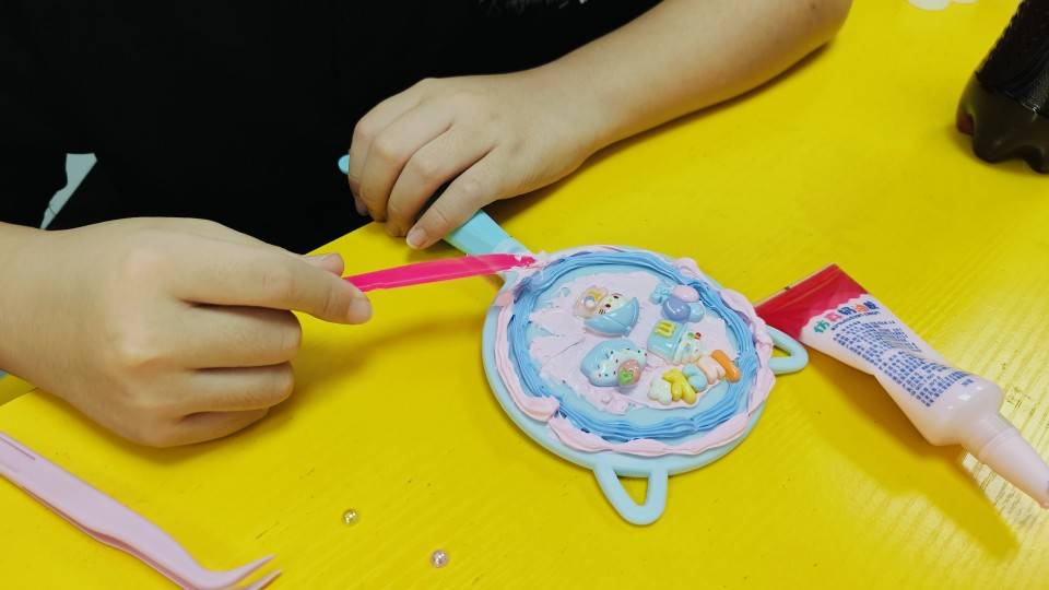 本次活动中,孩子们以一面面小巧圆润的镜子为画布,用五彩缤纷的奶油胶勾勒梦想轮廓,搭配小珠子、亮片、塑料小花等装饰配件,在小铲子与镊子的巧妙配合下,将平凡化为惊艳。