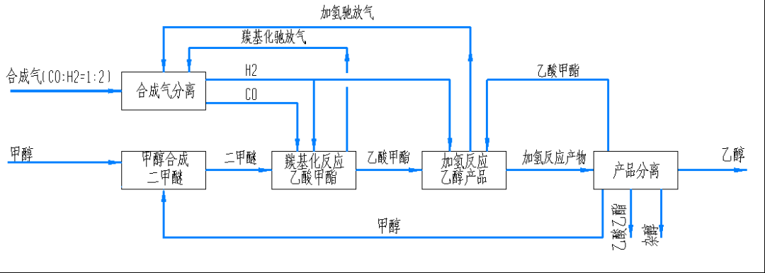 其中DME可来源于合成气直接合成,也可经甲醇脱水得到,分离杂质后,二甲醚汽化与CO混合进入羰基化反应器,生成乙酸甲酯(MAC),分离杂质后乙酸甲酯与氢气在加氢反应器中生成乙醇和甲醇,经分离后乙醇作为产品,甲醇返回二甲醚合成单元作为原料又可循环利用。