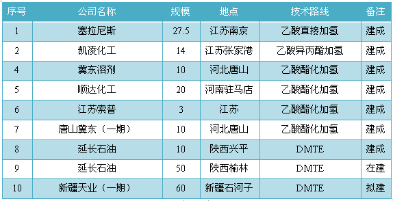 煤经合成气制乙醇项目在国内发展较快,目前已经建成产能94.5万吨,在建和拟建产能达110万吨,总产能达204.5万吨。