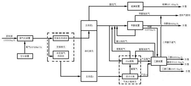 该项目以西湾露天煤矿为原料,采用HT-L煤气化技术生产粗煤气,其中一股粗煤气进行变换,另一股粗煤气进行余热回收利用,再分别经过低温甲醇洗脱除其中的硫和二氧化碳,未经变换的煤气净化后经过深冷分离为H2和CO,经变换的煤气部分送PSA制氢、部分送甲醇合成装置生产甲醇,CO、H2和甲醇送乙醇装置。流程示意如图1。