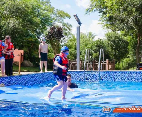 随后,教官组织大家一起做游戏、唱歌跳舞,度过了一个让人难忘的夜晚。第二天的活动则更为简单,却更加快乐。首先进行的是一场泳池大派对,孩子们在泳池里游泳、玩水,好不快乐。为了让大家玩得更尽兴,教官还带领着孩子们体验了水上魔毯,在魔毯上奔跑,感受水的魅力。