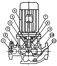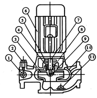 IRG型结构说明: 1.泵体与上部结构中间装有隔热盖,适用于介质温度T〈120度的场合。 2.泵与电机轴承组合装置,保证轴运转精度,提高了密封的可靠性。 3.可根据用户要求隔热盖内安装风冷装置。 |