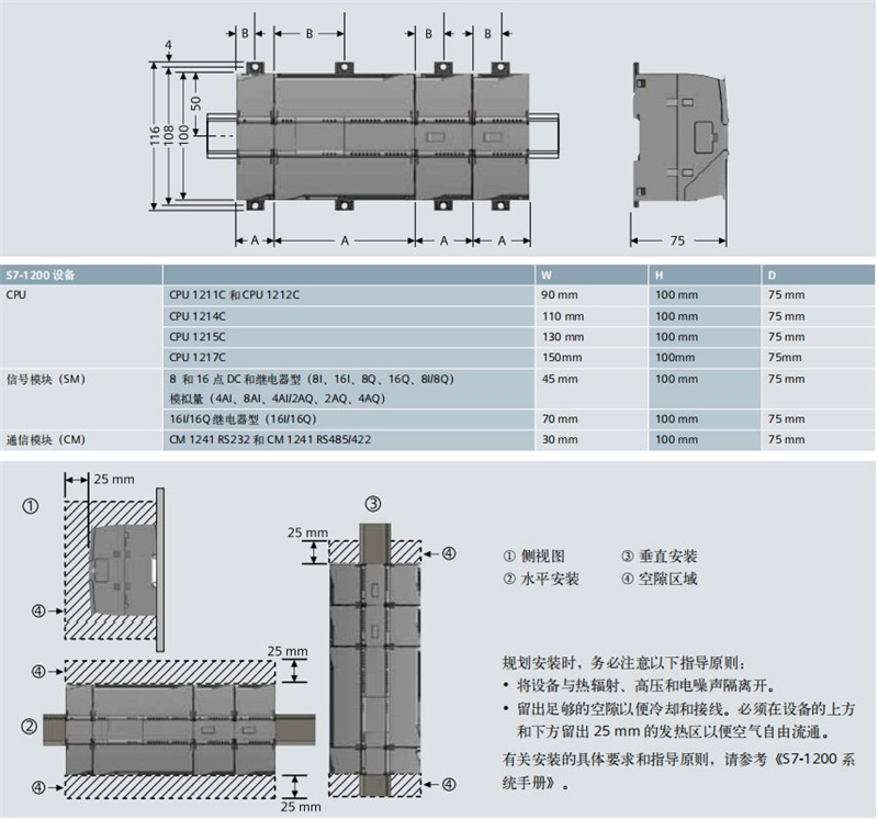 所有的 SIMATIC S7-1200 硬件在设计时都力求紧凑,以节省在控制 柜中的安装占用空间。例如,CPU 1215C 的宽度仅有 130 mm, CPU 1214C 的宽度仅有 110 mm,CPU 1212C 和 CPU 1211C 的宽 度也仅有 90 mm。通信模块和信号模块的体积也十分小巧,使得 这个紧凑的模块化系统大大节省了空间,从而在安装过程中为您提 供了最高的效率和灵活性。